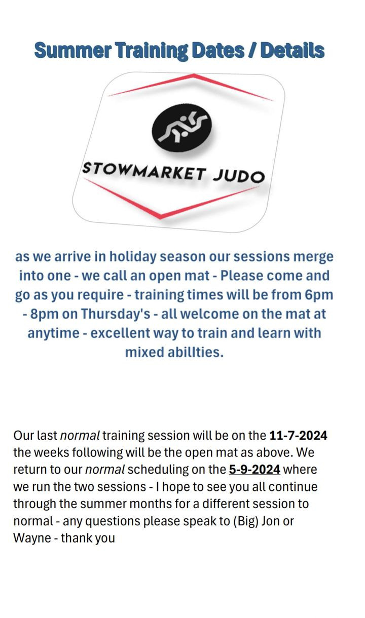 Why not come and try out an Olympic sport? Anybody aged between 5-100 you’re very welcome come and give it a try! Stowmarket leisure centre main hall Thursday 6pm-8pm! Stowmarket Judo Club (S.J.C)